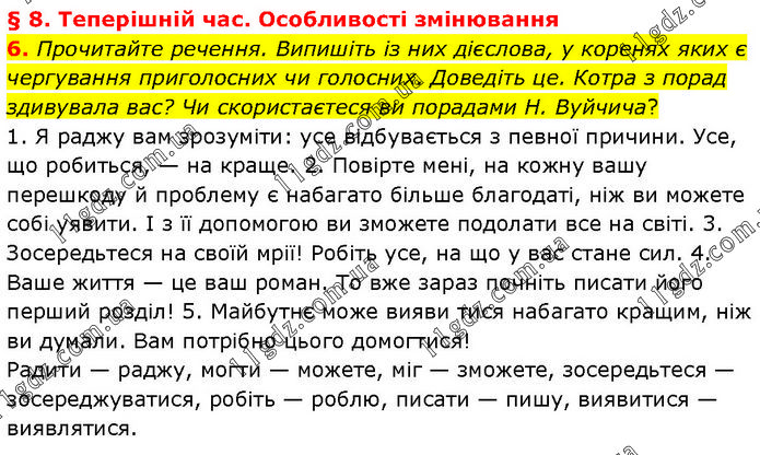 § 8. Теперішній час. Особливості змінювання 6. Прочитайте речення. Випишіть із них дієслова, у коренях яких є чергування приголосних чи голосних. Доведіть це. Котра з порад здивувала вас? Чи скористаєтеся ви порадами Н. Вуйчича? 1. Я раджу вам зрозуміти: усе відбувається з певної причини. Усе, що робиться, — на краще. 2. Повірте мені, на кожну вашу перешкоду й проблему є набагато більше благодаті, ніж ви можете собі уявити. І з її допомогою ви зможете подолати все на світі. 3. Зосередьтеся на своїй мрії! Робіть усе, на що у вас стане сил. 4. Ваше життя — це ваш роман. То вже зараз почніть писати його перший розділ! 5. Майбутнє може вияви тися набагато кращим, ніж ви думали. Вам потрібно цього домогтися! Радити — раджу, могти — можете, міг — зможете, зосередьтеся — зосереджуватися, робіть — роблю, писати — пишу, виявитися — виявлятися.