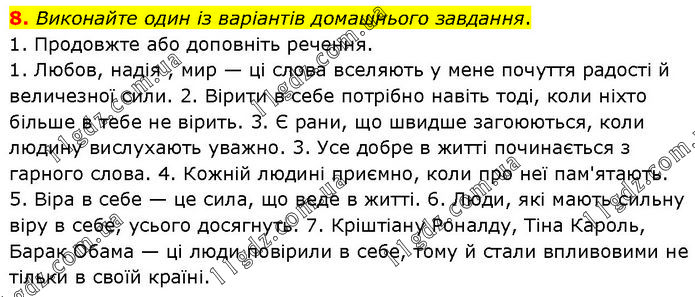 Виконайте один із варіантів домашнього завдання. 1. Продовжте або доповніть речення. 1. Любов, надія , мир — ці слова вселяють у мене почуття радості й величезної сили. 2. Вірити в себе потрібно навіть тоді, коли ніхто більше в тебе не вірить. 3. Є рани, що швидше загоюються, коли людину вислухають уважно. 3. Усе добре в житті починається з гарного слова. 4. Кожній людині приємно, коли про неї пам'ятають. 5. Віра в себе — це сила, що веде в житті. 6. Люди, які мають сильну віру в себе, усього досягнуть. 7. Кріштіану Роналду, Тіна Кароль, Барак Обама — ці люди повірили в себе, тому й стали впливовими не тільки в своїй країні.