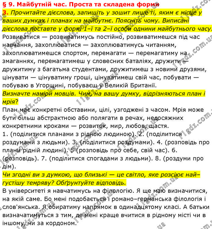 § 9. Майбутній час. Проста та складена форми 3. Прочитайте дієслова, запишіть у зошит лише ті, яким є місце у ваших думках і планах на майбутнє. Поясніть чому. Виписані дієслова поставте у формі 1–ї та 2–ї особи однини майбутнього часу. Розвиватися — розвиватимусь постійно, розвиватимешся під час навчання, захоплюватися — захоплюватимусь читанням, захоплюватимешся спортом, перемагати — перемагатиму на змаганнях, перемагатимеш у словесних баталіях, дружити — дружитиму з багатьма студентами, дружитимеш з новими друзями, цінувати — цінуватиму гроші, цінуватимеш свій час, побувати — побуваю в Угорщині, побуваєш у Великій Британії. Визначте наміри мовців. Чим, на вашу думку, відрізняються план і мрія? План має конкретні обставини, цілі, узгоджені з часом. Мрія може бути більш абстрактною або полягати в речах, недосяжних конкретними кроками — розвиток, мир, любов, щастя. 1. (поділитися планами з рідною людиною). 2. (поділитися роздумами з людьми). 3. (поділитися роздумами). 4. (розповідь про плани рідній людині). 5 (розповідь про себе, свій час). 6. (розповідь). 7. (поділитися спогадами з людьми). 8. (роздуми про дім). Чи згодні ви з думкою, що близькі — це світло, яке розсіює най–густішу темряву? Обґрунтуйте відповідь. В університеті я навчатимусь на філологію. Я ще маю визначитися, на якій саме. Бо мені подобається і романо–германська філологія і слов'янська. Я обиратиму напрямок в одинадцятому класі. А батьки визначатимуться з тим, де мені краще вчитися в рідному місті чи в іншому, чи за кордоном.