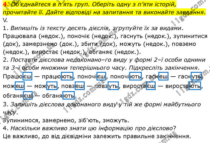 Об’єднайтеся в п’ять груп. Оберіть одну з п’яти історій, прочитайте її. Дайте відповіді на запитання та виконайте завдання. V. 1. Випишіть із тексту десять дієслів, згрупуйте їх за видами. Працювала (недок.), поночіє (недок.), гаснуть (недок.), зупинитися (док), замерзнемо (док.), збити (док), можуть (недок.), повземо (недок.), виростає (недок.), обганяє (недок.). 2. Поставте дієслова недоконано–го виду у формі 2–ї особи однини та 3–ї особи множини теперішнього часу. Підкресліть закінчення. Працюєш — працюють, поночієш, поночіють, гаснеш — гаснуть, можеш — можуть, повзеш — повзуть, виростаєш — виростають, обганяєш — обганяють. 3. Запишіть дієслова доконаного виду у тій же формі майбутнього часу. Зупинимося, замернемо, зіб'ють, зможуть. 4. Наскільки важливо знати цю інформацію про дієслово? Це важливо, до від дієвідміни залежить правильне закінчення.