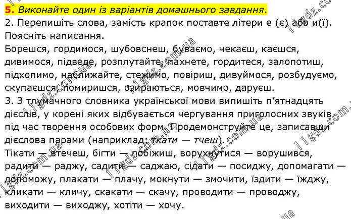 Виконайте один із варіантів домашнього завдання. 2. Перепишіть слова, замість крапок поставте літери е (є) або и(ї). Поясніть написання. Борешся, гордимося, шубовснеш, буваємо, чекаєш, каєшся, дивимося, підведе, розплутайте, пахнете, гордитеся, залопотиш, підхопимо, наближайте, стежимо, повіриш, дивуймося, розбудуємо, скупаєшся, помиришся, озираються, мовчимо, даруєш. 3. З тлумачного словника української мови випишіть п’ятнадцять дієслів, у корені яких відбувається чергування приголосних звуків під час творення особових форм. Продемонструйте це, записавши дієслова парами (наприклад: ткати — тчеш). Тікати — втечеш, бігти — побіжиш, ворухнутися — ворушився, радити — раджу, садити — саджаю, сідати — посиджу, допомагати — допоможу, плакати — плачу, мокнути — змочити, їздити — їжджу, кликати — кличу, скакати — скачу, проводити — проводжу, виходити — виходжу, хотіти — хочу.