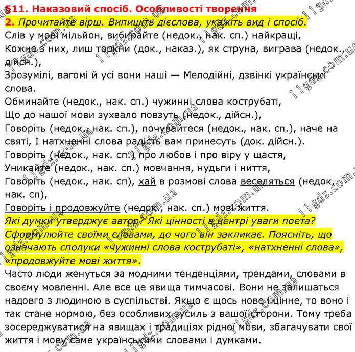 §11. Наказовий спосіб. Особливості творення 2. Прочитайте вірш. Випишіть дієслова, укажіть вид і спосіб. Слів у мові мільйон, вибирайте (недок., нак. сп.) найкращі, Кожне з них, лиш торкни (док., наказ.), як струна, виграва (недок., дійсн.), Зрозумілі, вагомі й усі вони наші — Мелодійні, дзвінкі українські слова. Обминайте (недок., нак. сп.) чужинні слова кострубаті, Що до нашої мови зухвало повзуть (недок., дійсн.), Говоріть (недок., нак. сп.), почувайтеся (недок., нак. сп.), наче на святі, І натхненні слова радість вам принесуть (док. дійсн.). Говоріть (недок., нак. сп.) про любов і про віру у щастя, Уникайте (недок., нак. сп.) мовчання, нудьги і ниття, Говоріть (недок., нак. сп), хай в розмові слова веселяться (недок, нак. сп), Говоріть і продовжуйте (недок., нак. сп.) мові життя. Які думки утверджує автор? Які цінності в центрі уваги поета? Сформулюйте своїми словами, до чого він закликає. Поясніть, що означають сполуки «чужинні слова кострубаті», «натхненні слова», «продовжуйте мові життя». Часто люди женуться за модними тенденціями, трендами, словами в своєму мовленні. Але все це явища тимчасові. Вони не залишаться надовго з людиною в суспільстві. Якщо є щось нове і цінне, то воно і так стане нормою, без особливих зусиль з вашої сторони. Тому треба зосереджуватися на явищах і традиціях рідної мови, збагачувати свої життя і мову саме українськими словами і думками.