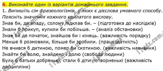 Виконайте один із варіантів домашнього завдання. 1. Випишіть сім фразеологізмів, у яких є дієслова умовного способу. Поясніть значення кожного крилатого вислову. Знав би, де впаду, солому підклав би. – (підготовка до наслідків) Знали б прикуп, купили би побільше. – (аналіз обстановки) Знав би де початок, знайшов би і кінець. (важливість порядку) Менше б розмовяли, більше би зробили. (працездатність) Не вчився б дитиною, помер би скотиною. (важливість навчання) Знайти би волю, знайдемо і долю (свобода людини) Були б батьки добренькі, стали б діти потворненькі (важливість дисципліни)