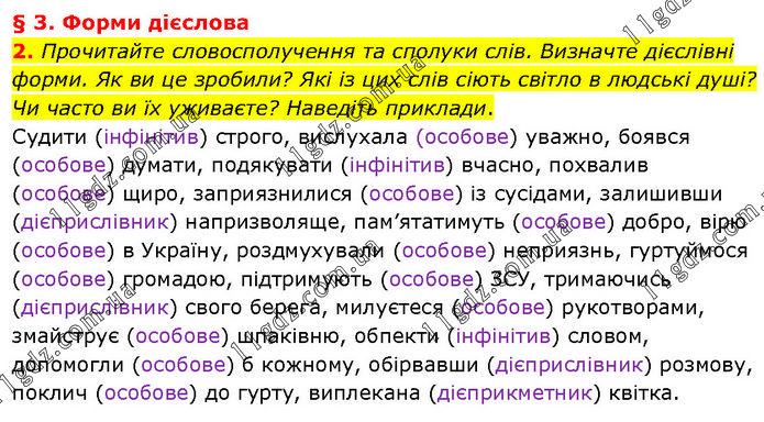 § 3. Форми дієслова 2. Прочитайте словосполучення та сполуки слів. Визначте дієслівні форми. Як ви це зробили? Які із цих слів сіють світло в людські душі? Чи часто ви їх уживаєте? Наведіть приклади. Судити (інфінітив) строго, вислухала (особове) уважно, боявся (особове) думати, подякувати (інфінітив) вчасно, похвалив (особове) щиро, заприязнилися (особове) із сусідами, залишивши (дієприслівник) напризволяще, пам’ятатимуть (особове) добро, вірю (особове) в Україну, роздмухували (особове) неприязнь, гуртуймося (особове) громадою, підтримують (особове) ЗСУ, тримаючись (дієприслівник) свого берега, милуєтеся (особове) рукотворами, змайструє (особове) шпаківню, обпекти (інфінітив) словом, допомогли (особове) б кожному, обірвавши (дієприслівник) розмову, поклич (особове) до гурту, виплекана (дієприкметник) квітка.