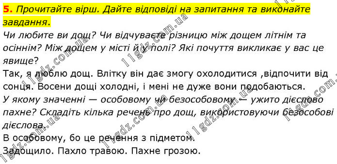 Прочитайте вірш. Дайте відповіді на запитання та виконайте завдання. Чи любите ви дощ? Чи відчуваєте різницю між дощем літнім та осіннім? Між дощем у місті й у полі? Які почуття викликає у вас це явище? Так, я люблю дощ. Влітку він дає змогу охолодитися ,відпочити від сонця. Восени дощі холодні, і мені не дуже вони подобаються. У якому значенні — особовому чи безособовому — ужито дієслово пахне? Складіть кілька речень про дощ, використовуючи безособові дієслова. В особовому, бо це речення з підметом. Задощило. Пахло травою. Пахне грозою.