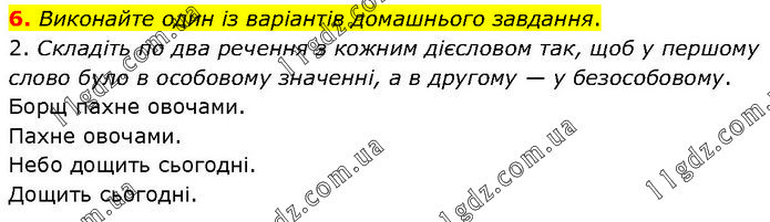 Виконайте один із варіантів домашнього завдання. 2. Складіть по два речення з кожним дієсловом так, щоб у першому слово було в особовому значенні, а в другому — у безособовому. Борщ пахне овочами. Пахне овочами. Небо дощить сьогодні. Дощить сьогодні.