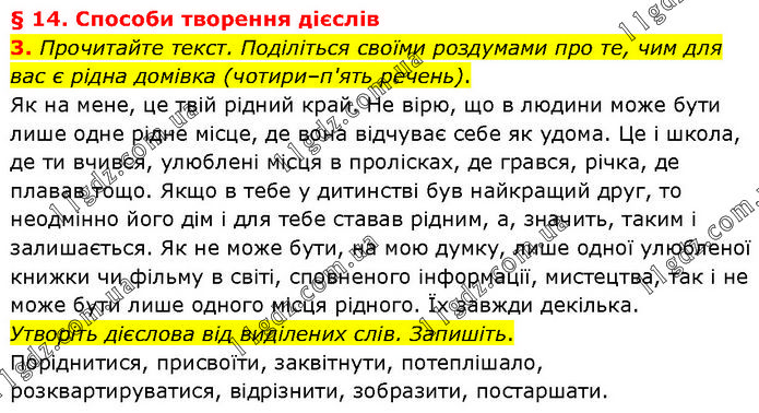 § 14. Способи творення дієслів 3. Прочитайте текст. Поділіться своїми роздумами про те, чим для вас є рідна домівка (чотири–п'ять речень). Як на мене, це твій рідний край. Не вірю, що в людини може бути лише одне рідне місце, де вона відчуває себе як удома. Це і школа, де ти вчився, улюблені місця в пролісках, де грався, річка, де плавав тощо. Якщо в тебе у дитинстві був найкращий друг, то неодмінно його дім і для тебе ставав рідним, а, значить, таким і залишається. Як не може бути, на мою думку, лише одної улюбленої книжки чи фільму в світі, сповненого інформації, мистецтва, так і не може бути лише одного місця рідного. Їх завжди декілька. Утворіть дієслова від виділених слів. Запишіть. Поріднитися, присвоїти, заквітнути, потеплішало, розквартируватися, відрізнити, зобразити, постаршати.