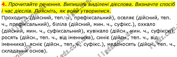 Прочитайте речення. Випишіть виділені дієслова. Визначте спосіб і час дієслів. Поясніть, як вони утворилися. Проходить (дійсний, теп. ч., префіксальний), оселяє (дійсний, теп. ч., префіксальний), біліла (дійсний, мин. ч., суфікс.), охкало (дійсний, мин. ч., суфіксальний), кувікало (дійсн., мин. ч., суфіксю), росять (дійсн., теп. ч., від іменника), синіє (дійсн., теп. ч., від іменника), ясніє (дійсн., теп. ч., суфікс.), медоносять (дійсн., теп. ч., складання основ).