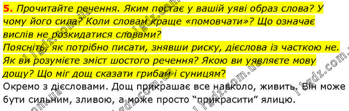 Прочитайте речення. Яким постає у вашій уяві образ слова? У чому його сила? Коли словам краще «помовчати»? Що означає вислів не розкидатися словами? Поясніть, як потрібно писати, знявши риску, дієслова із часткою не. Як ви розумієте зміст шостого речення? Якою ви уявляєте мову дощу? Що міг дощ сказати грибам і суницям? Окремо з дієсловами. Дощ прикрашає все навколо, живить. Він може бути сильним, зливою, а може просто “прикрасити” ялицю.