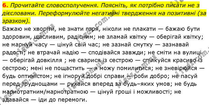 Прочитайте словосполучення. Поясніть, як потрібно писати не з дієсловами. Переформулюйте негативні твердження на позитивні (за зразком). Бажаю не хворіти, не знати горя, ніколи не плакати — бажаю бути здоровим, щасливим, радісним; не зламай квітку — оберігай квітку; не марнуй часу — цінуй свій час; не зазнай смутку — зазнавай радості; не втрачай надію — сподівайся завжди; не сміти на вулиці — оберігай довкілля ; не сварися із сестрою — спілкуйся красиво із сестрою; мені не пощастить — я можу помилитися; не зневірюйся — будь оптимістом; не ігноруй добрі справи — роби добро; не пасуй перед труднощами — рухайся вперед за будь–яких умов; не будь марнотратним/марнотратною — цінуй гроші і можливості; не здавайся — іди до перемоги.
