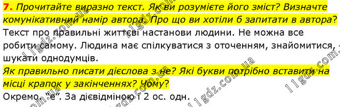 Прочитайте виразно текст. Як ви розумієте його зміст? Визначте комунікативний намір автора. Про що ви хотіли б запитати в автора? Текст про правильні життєві настанови людини. Не можна все робити самому. Людина має спілкуватися з оточенням, знайомитися, шукати однодумців. Як правильно писати дієслова з не? Які букви потрібно вставити на місці крапок у закінченнях? Чому? Окремо. “е”. За дієвідміною і 2 ос. одн.