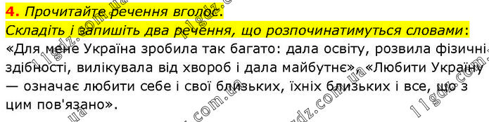 Прочитайте речення вголос. Складіть і запишіть два речення, що розпочинатимуться словами: «Для мене Україна зробила так багато: дала освіту, розвила фізичні здібності, вилікувала від хвороб і дала майбутнє», «Любити Україну — означає любити себе і свої близьких, їхніх близьких і все, що з цим пов'язано».