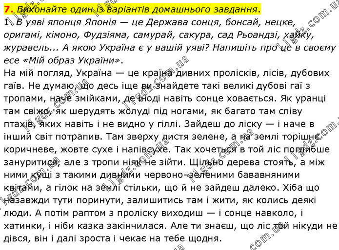 Виконайте один із варіантів домашнього завдання. 1. В уяві японця Японія — це Держава сонця, бонсай, нецке, оригамі, кімоно, Фудзіяма, самурай, сакура, сад Рьоандзі, хайку, журавель... А якою Україна є у вашій уяві? Напишіть про це в своєму есе «Мій образ України». На мій погляд, Україна — це країна дивних пролісків, лісів, дубових гаїв. Не думаю, що десь іще ви знайдете такі великі дубові гаї з тропами, наче змійками, де іноді навіть сонце ховається. Як уранці там свіжо, як шерудять жолуді під ногами, як багато там співу птахів, яких навіть і не видно у гіллі. Зайдеш до ліску — і наче в інший світ потрапив. Там зверху листя зелене, а на землі торішнє коричневе, жовте сухе і напівсухе. Так хочеться в той ліс поглибше зануритися, але з тропи ніяк не зійти. Щільно дерева стоять, а між ними кущі з такими дивними червоно–зеленими бававняними квітами, а гілок на землі стільки, що й не зайдеш далеко. Хіба що назавжди тути поринути, залишитись там і жити, як колись деякі люди. А потім раптом з проліску виходиш — і сонце навколо, і хатинки, і ніби казка закінчилася. Але ти знаєш, що ліс той нікуди не дівся, він і далі зроста і чекає на тебе щодня.