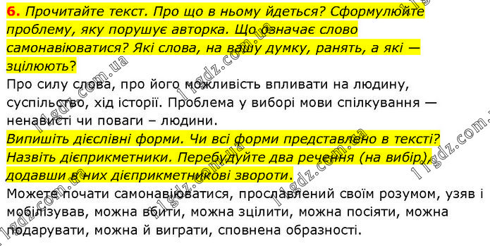 Прочитайте текст. Про що в ньому йдеться? Сформулюйте проблему, яку порушує авторка. Що означає слово самонавіюватися? Які слова, на вашу думку, ранять, а які — зцілюють? Про силу слова, про його можливість впливати на людину, суспільство, хід історії. Проблема у виборі мови спілкування — ненависті чи поваги – людини. Випишіть дієслівні форми. Чи всі форми представлено в тексті? Назвіть дієприкметники. Перебудуйте два речення (на вибір), додавши в них дієприкметникові звороти. Можете почати самонавіюватися, прославлений своїм розумом, узяв і мобілізував, можна вбити, можна зцілити, можна посіяти, можна подарувати, можна й виграти, сповнена образності.