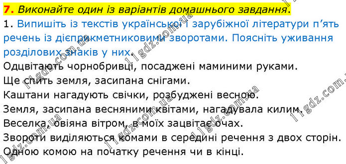 Виконайте один із варіантів домашнього завдання. 1. Випишіть із текстів української і зарубіжної літератури п’ять речень із дієприкметниковими зворотами. Поясніть уживання розділових знаків у них. Одцвітають чорнобривці, посаджені маминими руками. Ще спить земля, засипана снігами. Каштани нагадують свічки, розбуджені весною. Земля, засипана весняними квітами, нагадувала килим. Веселка, овіяна вітром, в моїх зацвітає очах. Звороти виділяються комами в середині речення з двох сторін. Одною комою на початку речення чи в кінці.
