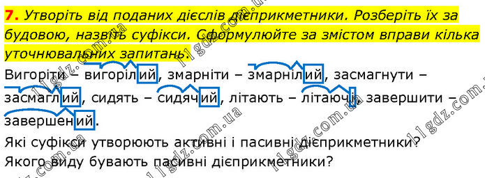 Утворіть від поданих дієслів дієприкметники. Розберіть їх за будовою, назвіть суфікси. Сформулюйте за змістом вправи кілька уточнювальних запитань. Вигоріти – вигорілий, змарніти – змарнілий, засмагнути – засмаглий, сидять – сидячий, літають – літаючі, завершити – завершений. Які суфікси утворюють активні і пасивні дієприкметники? Якого виду бувають пасивні дієприкметники?