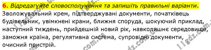 Відредагуйте словосполучення та запишіть правильні варіанти. Зволожувальний крем, підтверджувані документи, початківець будівельник, увімкнені крани, ближня споруда, шокуючий приклад, наступний тиждень, прийдешній новий рік, навколишнє середовище, заможня країна, регулятивна система, супровідні документи, очисний пристрій.