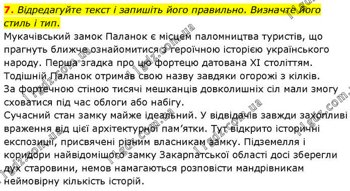 Відредагуйте текст і запишіть його правильно. Визначте його стиль і тип. Мукачівський замок Паланок є місцем паломництва туристів, що прагнуть ближче ознайомитися з героїчною історією українського народу. Перша згадка про цю фортецю датована XI століттям. Тодішній Паланок отримав свою назву завдяки огорожі з кілків. За фортечною стіною тисячі мешканців довколишніх сіл мали змогу сховатися під час облоги або набігу. Сучасний стан замку майже ідеальний. У відвідачів завжди захопливі враження від цієї архітектурної пам’ятки. Тут відкрито історичні експозиції, присвячені різним власникам замку. Підземелля і коридори найвідомішого замку Закарпатської області досі зберегли дух старовини, немов намагаються розповісти мандрівникам неймовірну кількість історій.