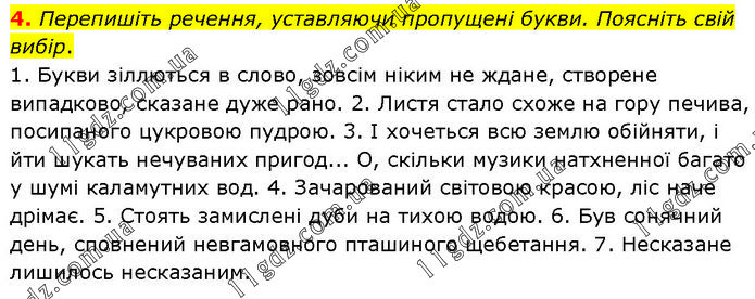 4. Перепишіть речення, уставляючи пропущені букви. Поясніть свій вибір. 1. Букви зіллються в слово, зовсім ніким не ждане, створене випадково, сказане дуже рано. 2. Листя стало схоже на гору печива, посипаного цукровою пудрою. 3. І хочеться всю землю обійняти, і йти шукать нечуваних пригод... О, скільки музики натхненної багато у шумі каламутних вод. 4. Зачарований світовою красою, ліс наче дрімає. 5. Стоять замислені дуби на тихою водою. 6. Був сонячний день, сповнений невгамовного пташиного щебетання. 7. Несказане лишилось несказаним.