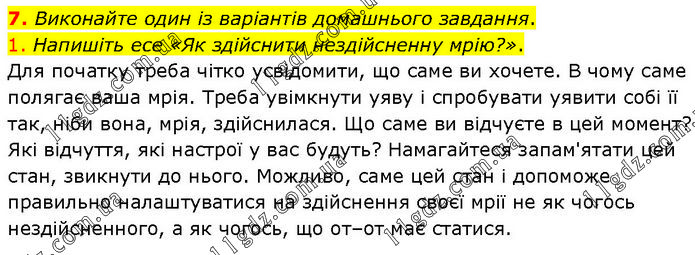 7. Виконайте один із варіантів домашнього завдання. 1. Напишіть есе «Як здійснити нездійсненну мрію?». Для початку треба чітко усвідомити, що саме ви хочете. В чому саме полягає ваша мрія. Треба увімкнути уяву і спробувати уявити собі її так, ніби вона, мрія, здійснилася. Що саме ви відчуєте в цей момент? Які відчуття, які настрої у вас будуть? Намагайтеся запам'ятати цей стан, звикнути до нього. Можливо, саме цей стан і допоможе правильно налаштуватися на здійснення своєї мрії не як чогось нездійсненного, а як чогось, що от–от має статися.