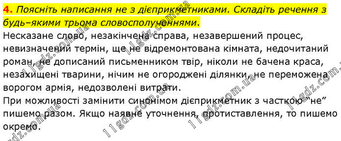 Поясніть написання не з дієприкметниками. Складіть речення з будь–якими трьома словосполученнями. Несказане слово, незакінчена справа, незавершений процес, невизначений термін, ще не відремонтована кімната, недочитаний роман, не дописаний письменником твір, ніколи не бачена краса, незахищені тварини, нічим не огороджені ділянки, не переможена ворогом армія, недозволені витрати. При можливості замінити синонімом дієприкметник з часткою “не” пишемо разом. Якщо наявне уточнення, протиставлення, то пишемо окремо.