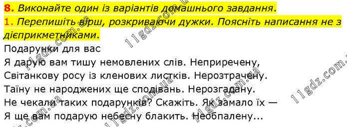 Виконайте один із варіантів домашнього завдання. 1. Перепишіть вірш, розкриваючи дужки. Поясніть написання не з дієприкметниками. Подарунки для вас Я дарую вам тишу немовлених слів. Неприречену, Світанкову росу із кленових листків. Нерозтрачену. Таїну не народжених ще сподівань. Нерозгадану. Не чекали таких подарунків? Скажіть. Як замало їх — Я ще вам подарую небесну блакить. Необпалену...
