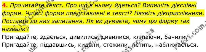 Прочитайте текст. Про що в ньому йдеться? Випишіть дієслівні форми. Чи всі форми представлені в тексті? Назвіть дієприслівники. Поставте до них запитання. Як ви думаєте, чому цю форму так назвали? Пригадайте, здається, дивились, дивилися, кліпаючи, бачили, Пригадайте, піддавшись, кидали, стежили, летить, наближається.