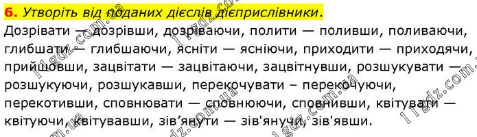 Утворіть від поданих дієслів дієприслівники. Дозрівати — дозрівши, дозріваючи, полити — поливши, поливаючи, глибшати — глибшаючи, ясніти — ясніючи, приходити — приходячи, прийшовши, зацвітати — зацвітаючи, зацвітнувши, розшукувати — розшукуючи, розшукавши, перекочувати – перекочуючи, перекотивши, сповнювати — сповнюючи, сповнивши, квітувати — квітуючи, квітувавши, зів’янути — зів'янучи, зів'явши.