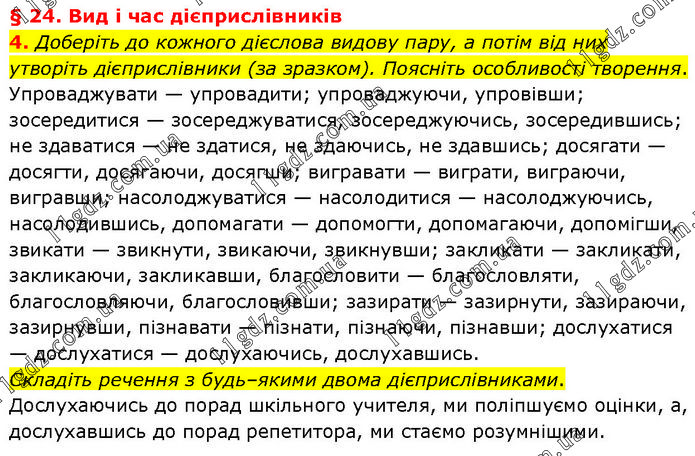 § 24. Вид і час дієприслівників 4. Доберіть до кожного дієслова видову пару, а потім від них утворіть дієприслівники (за зразком). Поясніть особливості творення. Упроваджувати — упровадити; упроваджуючи, упровівши; зосередитися — зосереджуватися, зосереджуючись, зосередившись; не здаватися — не здатися, не здаючись, не здавшись; досягати — досягти, досягаючи, досягши; вигравати — виграти, виграючи, вигравши; насолоджуватися — насолодитися — насолоджуючись, насолодившись, допомагати — допомогти, допомагаючи, допомігши, звикати — звикнути, звикаючи, звикнувши; закликати — закликати, закликаючи, закликавши, благословити — благословляти, благословляючи, благословивши; зазирати — зазирнути, зазираючи, зазирнувши, пізнавати — пізнати, пізнаючи, пізнавши; дослухатися — дослухатися — дослухаючись, дослухавшись. Складіть речення з будь–якими двома дієприслівниками. Дослухаючись до порад шкільного учителя, ми поліпшуємо оцінки, а, дослухавшись до порад репетитора, ми стаємо розумнішими.