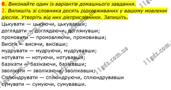 Виконайте один із варіантів домашнього завдання. 2. Випишіть зі словника десять рідковживаних у вашому мовленні дієслів. Утворіть від них дієприслівники. Запишіть. Цькувати — цькуючи, цькувавши; доглядати — доглядаючи, доглянувши; промовити — промовляючи, промовивши; Висіти — висячи, висівши; мудрувати — мудруючи, мудрувавши; нотувати — нотуючи, нотувавши; базікати — базікаючи, базікавши; зволікати — зволікаючи, зволікавши; Сплюндрувати — сплюндруючи, сплюндрувавши сумувати — сумуючи, сумувавши.