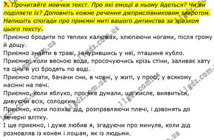 7. Прочитайте мовчки текст. Про які емоції в ньому йдеться? Чи ви поділяєте їх? Доповніть кожне речення дієприслівниковим зворотом. Напишіть спогади про приємні миті вашого дитинства за зразком цього тексту. Приємно бродити по теплих калюжах, хлюпаючи ногами, після грому й дощу. Приємно знайти в траві, занурившись у неї, пташине кубло. Приємно, коли весною вода, просочуючись крізь стіни, заливає хату та сіни й усі бродять по воді. Приємно спати, бачачи сни, в човні, у житі, у просі, у всякому насінні на печі. Приємно, коли яблуко, про яке думали, що кисле, виявиться, дивуючи всіх, солодким. Приємно, коли позіхає дід, розправляючи плечі, і дзвонять до вечерні влітку. І ще приємно, і дуже любив я, згадуючи про минуле, коли дід розмовляв із конем і лошам, як із людьми.