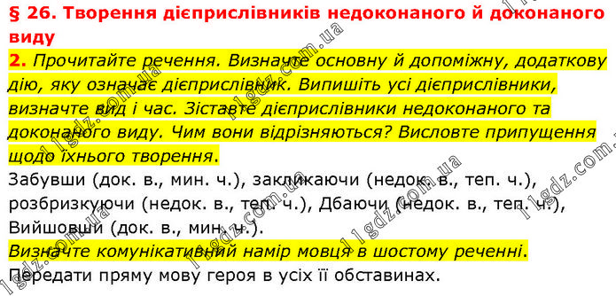 § 26. Творення дієприслівників недоконаного й доконаного виду 2. Прочитайте речення. Визначте основну й допоміжну, додаткову дію, яку означає дієприслівник. Випишіть усі дієприслівники, визначте вид і час. Зіставте дієприслівники недоконаного та доконаного виду. Чим вони відрізняються? Висловте припущення щодо їхнього творення. Забувши (док. в., мин. ч.), закликаючи (недок. в., теп. ч.), розбризкуючи (недок. в., теп. ч.), Дбаючи (недок. в., теп. ч.), Вийшовши (док. в., мин. ч.). Визначте комунікативний намір мовця в шостому реченні. Передати пряму мову героя в усіх її обставинах.