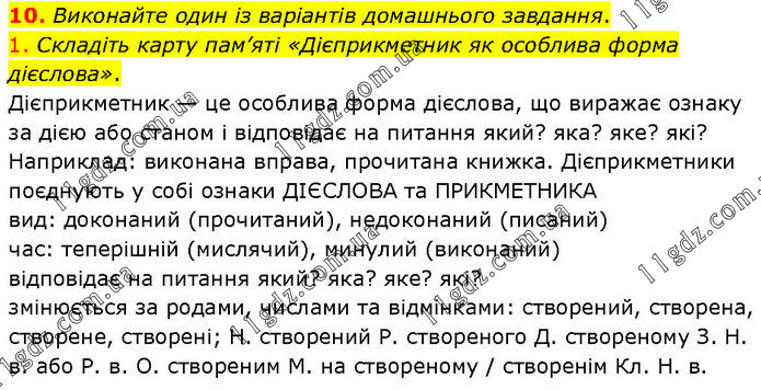 Виконайте один із варіантів домашнього завдання. 1. Складіть карту пам’яті «Дієприкметник як особлива форма дієслова». Дієприкметник — це особлива форма дієслова, що виражає ознаку за дією або станом і відповідає на питання який? яка? яке? які? Наприклад: виконана вправа, прочитана книжка. Дієприкметники поєднують у собі ознаки ДІЄСЛОВА та ПРИКМЕТНИКА вид: доконаний (прочитаний), недоконаний (писаний) час: теперішній (мислячий), минулий (виконаний) відповідає на питання який? яка? яке? які? змінюється за родами, числами та відмінками: створений, створена, створене, створені; Н. створений Р. створеного Д. створеному З. Н. в. або Р. в. О. створеним М. на створеному / створенім Кл. Н. в.