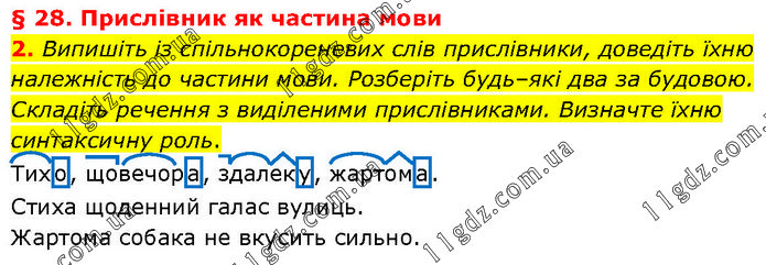 § 28. Прислівник як частина мови 2. Випишіть із спільнокореневих слів прислівники, доведіть їхню належність до частини мови. Розберіть будь–які два за будовою. Складіть речення з виділеними прислівниками. Визначте їхню синтаксичну роль. Тихо, щовечора, здалеку, жартома. Стиха щоденний галас вулиць. Жартома собака не вкусить сильно.