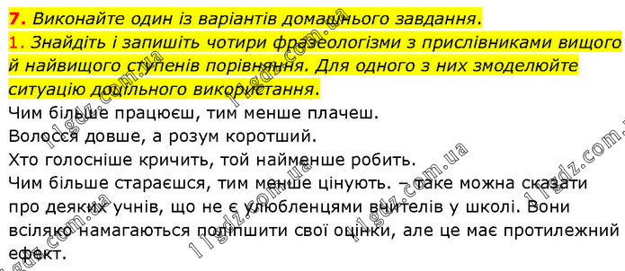 Виконайте один із варіантів домашнього завдання. 1. Знайдіть і запишіть чотири фразеологізми з прислівниками вищого й найвищого ступенів порівняння. Для одного з них змоделюйте ситуацію доцільного використання. Чим більше працюєш, тим менше плачеш. Волосся довше, а розум коротший. Хто голосніше кричить, той найменше робить. Чим більше стараєшся, тим менше цінують. – таке можна сказати про деяких учнів, що не є улюбленцями вчителів у школі. Вони всіляко намагаються поліпшити свої оцінки, але це має протилежний ефект.