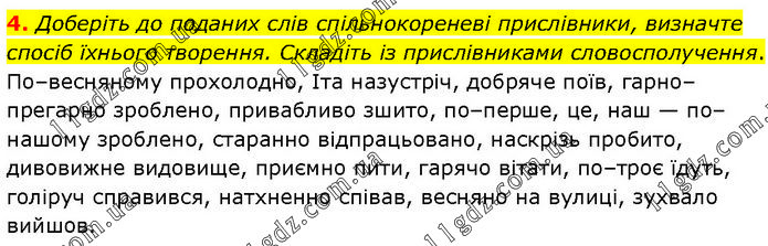 4. Доберіть до поданих слів спільнокореневі прислівники, визначте спосіб їхнього творення. Складіть із прислівниками словосполучення. По–весняному прохолодно, Іта назустріч, добряче поїв, гарно–прегарно зроблено, привабливо зшито, по–перше, це, наш — по–нашому зроблено, старанно відпрацьовано, наскрізь пробито, дивовижне видовище, приємно пити, гарячо вітати, по–троє їдуть, голіруч справився, натхненно співав, весняно на вулиці, зухвало вийшов.