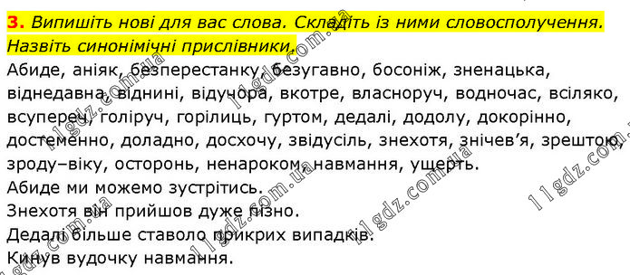 3. Випишіть нові для вас слова. Складіть із ними словосполучення. Назвіть синонімічні прислівники. Абиде, аніяк, безперестанку, безугавно, босоніж, зненацька, віднедавна, віднині, відучора, вкотре, власноруч, водночас, всіляко, всупереч, голіруч, горілиць, гуртом, дедалі, додолу, докорінно, достеменно, доладно, досхочу, звідусіль, знехотя, знічев’я, зрештою, зроду–віку, осторонь, ненароком, навмання, ущерть. Абиде ми можемо зустрітись. Знехотя він прийшов дуже пізно. Дедалі більше ставоло прикрих випадків. Кинув вудочку навмання.