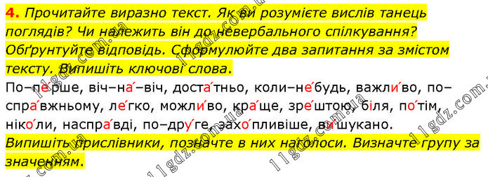 4. Прочитайте виразно текст. Як ви розумієте вислів танець поглядів? Чи належить він до невербального спілкування? Обґрунтуйте відповідь. Сформулюйте два запитання за змістом тексту. Випишіть ключові слова. По–пе՛рше, віч–на՛–віч, доста՛тньо, коли–не՛будь, важли՛во, по–спра՛вжньому, ле՛гко, можли՛во, кра՛ще, зре՛штою, біля, по՛тім, ніко՛ли, наспра՛вді, по–дру՛ге, захо՛пливіше, ви՛шукано. Випишіть прислівники, позначте в них наголоси. Визначте групу за значенням.