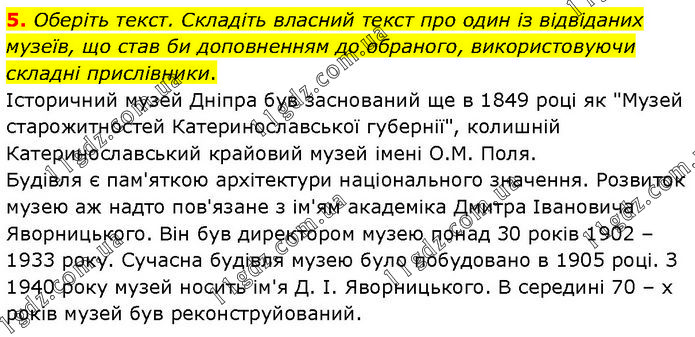 Оберіть текст. Складіть власний текст про один із відвіданих музеїв, що став би доповненням до обраного, використовуючи складні прислівники. Історичний музей Дніпра був заснований ще в 1849 році як "Музей старожитностей Катеринославської губернії", колишній Катеринославський крайовий музей імені О.М. Поля. Будівля є пам'яткою архітектури національного значення. Розвиток музею аж надто пов'язане з ім'ям академіка Дмитра Івановича Яворницького. Він був директором музею понад 30 років 1902 – 1933 року. Сучасна будівля музею було побудовано в 1905 році. З 1940 року музей носить ім'я Д. І. Яворницького. В середині 70 – х років музей був реконструйований.