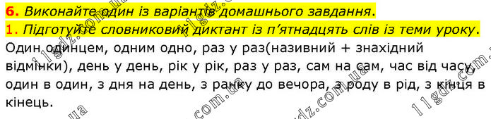 Виконайте один із варіантів домашнього завдання. 1. Підготуйте словниковий диктант із п’ятнадцять слів із теми уроку. Один одинцем, одним одно, раз у раз(називний + знахідний відмінки), день у день, рік у рік, раз у раз, сам на сам, час від часу, один в один, з дня на день, з ранку до вечора, з роду в рід, з кінця в кінець.