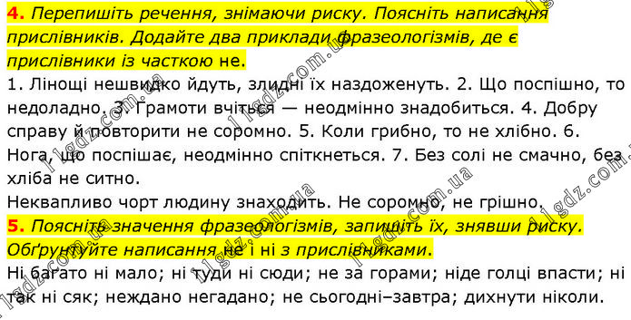 4. Перепишіть речення, знімаючи риску. Поясніть написання прислівників. Додайте два приклади фразеологізмів, де є прислівники із часткою не. 1. Лінощі нешвидко йдуть, злидні їх наздоженуть. 2. Що поспішно, то недоладно. 3. Грамоти вчіться — неодмінно знадобиться. 4. Добру справу й повторити не соромно. 5. Коли грибно, то не хлібно. 6. Нога, що поспішає, неодмінно спіткнеться. 7. Без солі не смачно, без хліба не ситно. Неквапливо чорт людину знаходить. Не соромно, не грішно. 5. Поясніть значення фразеологізмів, запишіть їх, знявши риску. Обґрунтуйте написання не і ні з прислівниками. Ні багато ні мало; ні туди ні сюди; не за горами; ніде голці впасти; ні так ні сяк; неждано негадано; не сьогодні–завтра; дихнути ніколи.