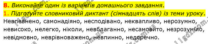 8. Виконайте один із варіантів домашнього завдання. 1. Підготуйте словниковий диктант (сімнадцять слів) із теми уроку. Невпевнено, самонадіяно, несподівано, неквапливо, нерозумно, невисоко, нелегко, ніколи, невблаганно, несамовито, незрозуміло, невідмовно, неврівноважено, невпинно, недоречно.