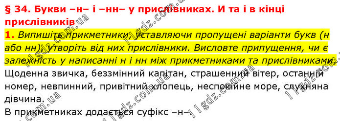 § 34. Букви –н– і –нн– у прислівниках. И та і в кінці прислівників 1. Випишіть прикметники, уставляючи пропущені варіанти букв (н або нн), утворіть від них прислівники. Висловте припущення, чи є залежність у написанні н і нн між прикметниками та прислівниками. Щоденна звичка, беззмінний капітан, страшенний вітер, останній номер, невпинний, привітний хлопець, неспокійне море, слухняна дівчина. В прикметниках додається суфікс –н–.