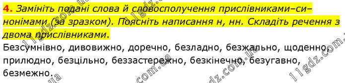 Замініть подані слова й словосполучення прислівниками–си–нонімами (за зразком). Поясніть написання н, нн. Складіть речення з двома прислівниками. Безсумнівно, дивовижно, доречно, безладно, безжально, щоденно, прилюдно, безцільно, беззастережно, безкінечно, безугавно, безмежно.