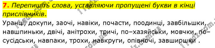 Перепишіть слова, уставляючи пропущені букви в кінці прислівників. Уранці, докупи, заочі, навіки, почасти, поодинці, завбільшки, навшпиньки, двічі, анітрохи, тричі, по–хазяйськи, мовчки, по–сусідськи, навпаки, трохи, навкруги, опівночі, завширшки.
