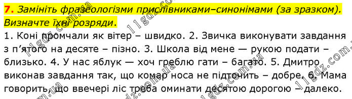 Замініть фразеологізми прислівниками–синонімами (за зразком). Визначте їхні розряди. 1. Коні промчали як вітер – швидко. 2. Звичка виконувати завдання з п’ятого на десяте – пізно. 3. Школа від мене — рукою подати – близько. 4. У нас яблук — хоч греблю гати – багато. 5. Дмитро виконав завдання так, що комар носа не підточить – добре. 6. Мама говорить, що ввечері ліс треба оминати десятою дорогою – далеко.