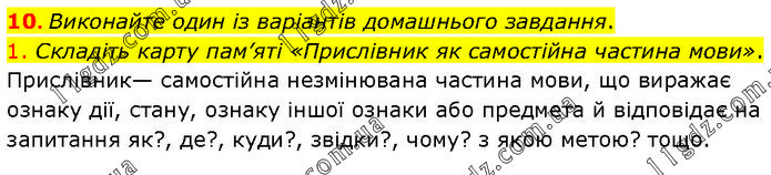 Виконайте один із варіантів домашнього завдання. 1. Складіть карту пам’яті «Прислівник як самостійна частина мови». Прислівник— самостійна незмінювана частина мови, що виражає ознаку дії, стану, ознаку іншої ознаки або предмета й відповідає на запитання як?, де?, куди?, звідки?, чому? з якою метою? тощо.