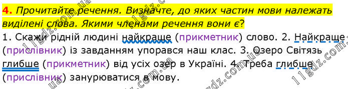 Прочитайте речення. Визначте, до яких частин мови належать виділені слова. Якими членами речення вони є? 1. Скажи рідній людині найкраще (прикметник) слово. 2. Найкраще (прислівник) із завданням упорався наш клас. 3. Озеро Світязь глибше (прикметник) від усіх озер в Україні. 4. Треба глибше (прислівник) занурюватися в мову.