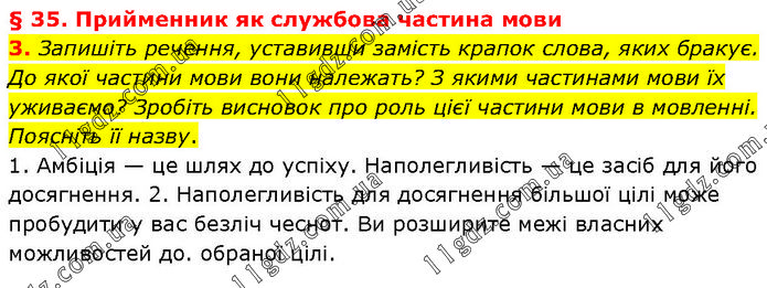 § 35. Прийменник як службова частина мови 3. Запишіть речення, уставивши замість крапок слова, яких бракує. До якої частини мови вони належать? З якими частинами мови їх уживаємо? Зробіть висновок про роль цієї частини мови в мовленні. Поясніть її назву. 1. Амбіція — це шлях до успіху. Наполегливість — це засіб для його досягнення. 2. Наполегливість для досягнення більшої цілі може пробудити у вас безліч чеснот. Ви розширите межі власних можливостей до. обраної цілі.