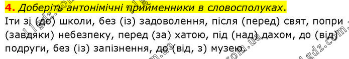 4. Доберіть антонімічні прийменники в словосполуках. Іти зі (до) школи, без (із) задоволення, після (перед) свят, попри (завдяки) небезпеку, перед (за) хатою, під (над) дахом, до (від) подруги, без (із) запізнення, до (від, з) музею.